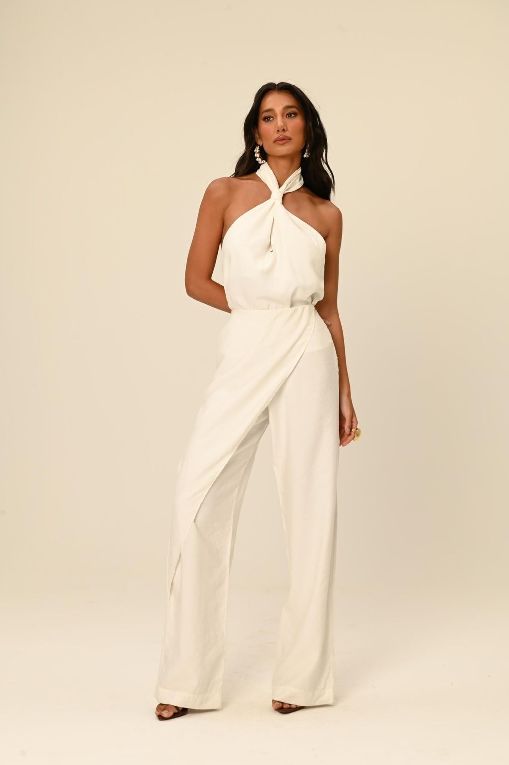 A calça possui fechamento com zíper e detalhe lateral não removível.