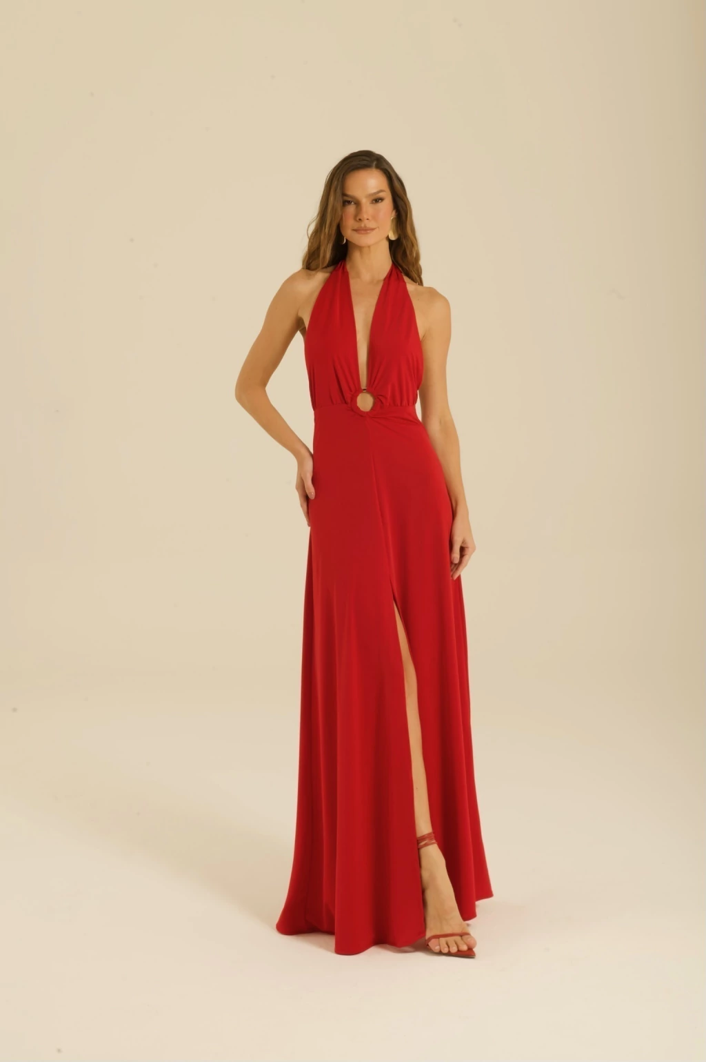 O vestido possui fechamento com zíper na saia, amarração permitindo regulagem no pescoço,