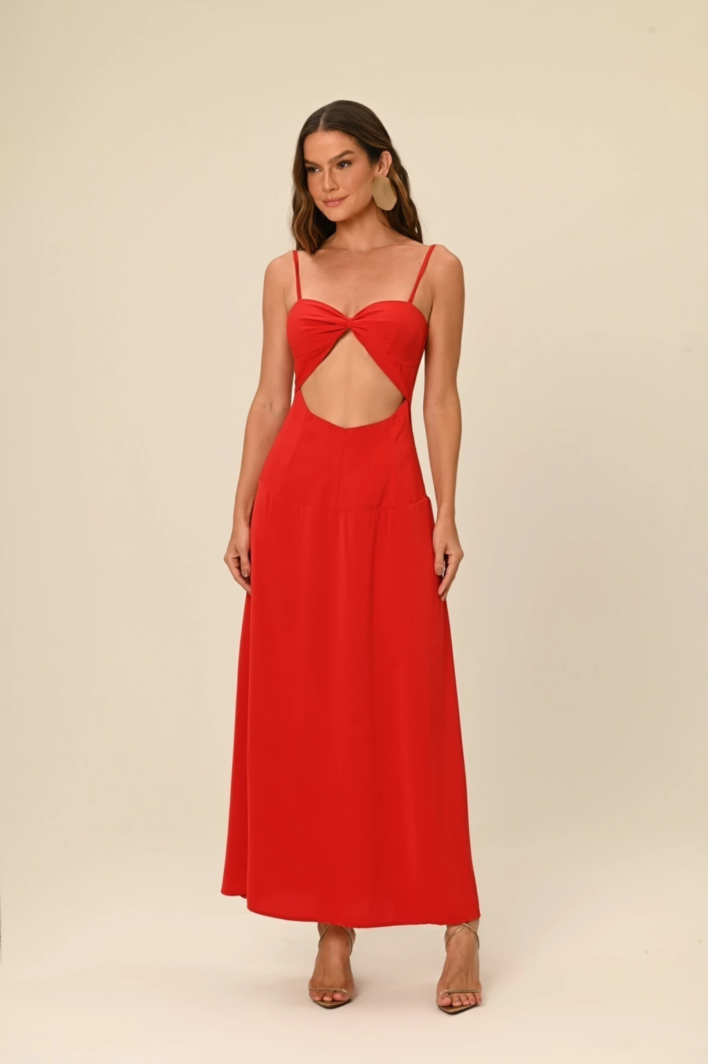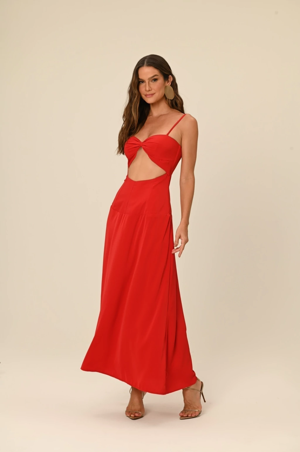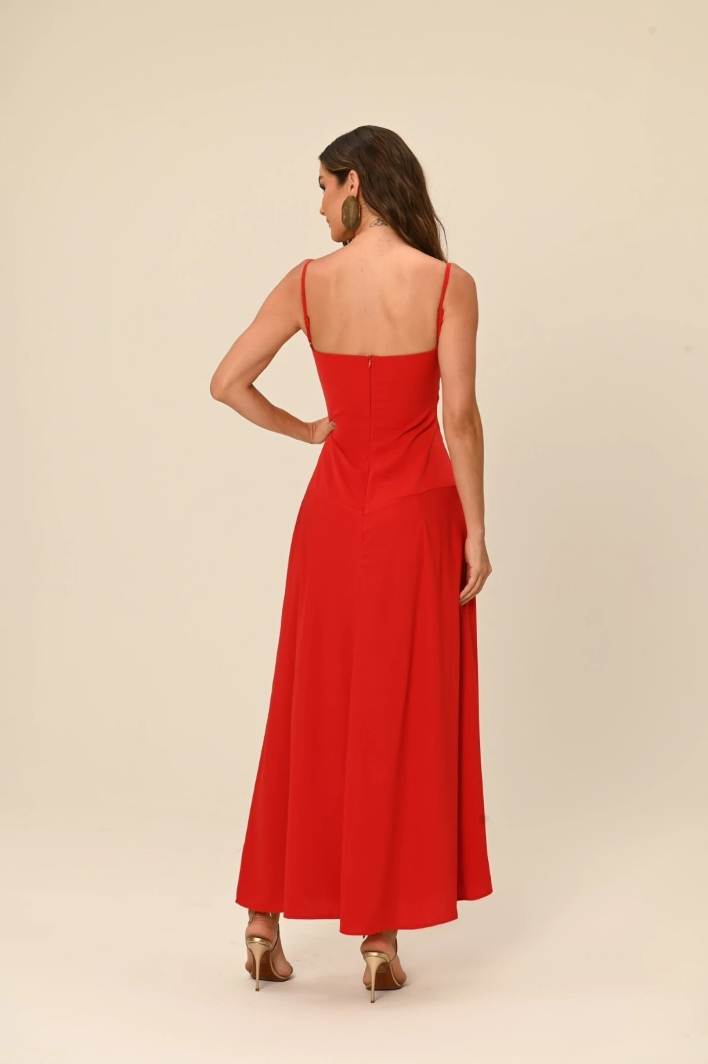 O vestido possui alças permitindo regulagem e fechamento com zíper.